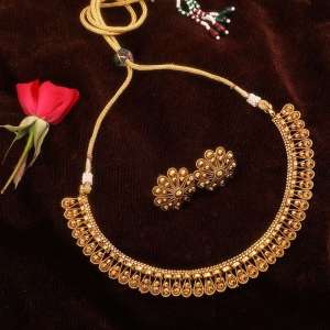 This jewellery set consists of a necklace and a pair of earrings With Maang Tika,Gold-plated and stranded necklace with Drawstring closure,A pair of matching earrings, secured with a post and back closure,A matching Maang Tika with hook closure,