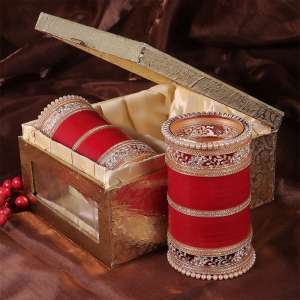 Women Gold Plated Pearl Beaded Design Red Bridal Stone Wedding Chuda.