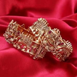 Women Gold Plated Red Stone Studded Elephant and Godess Temple Traditional Designer Bangles.