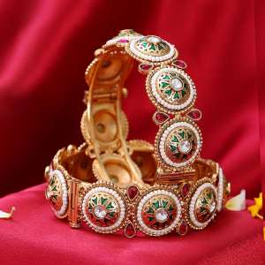 Women Gold Plated Red and Green Stone and Kundan Studded Brown Leaf Design Beautiful Handcrafted Designer Bangles.