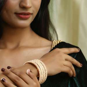 Women Set of 4 24CT gold-plated handcrafted Stone-Studded bangles, each has an intricate textured pattern