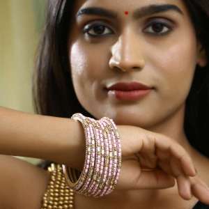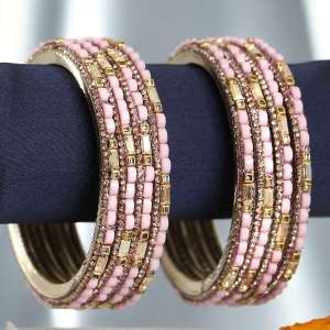 Women Set of 8 Gold Plated Pink Faux Beaded Stone Studded Bangles.