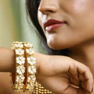 Women Gold Plated Stone Studded Flower Design Bangles.