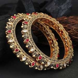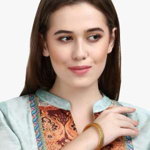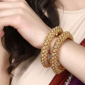 Women Set of Two 24CT Copper gold-plated Handcrafted stone-Studded with pearls Bangle each has an intricate textured pattern,