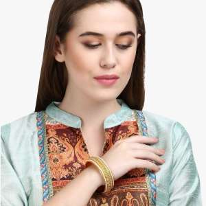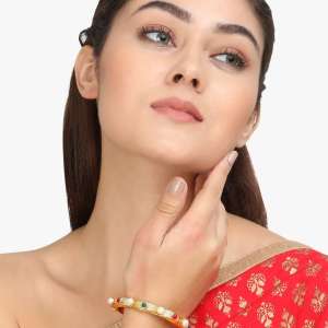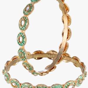 Women Gold-Plated Luk Kundan Golden-Pearl Set of 2 Bangles, Gold and Green Bangles handcrafted bangles, each has an intricate textured pattern Each secured with a Slip-on closure