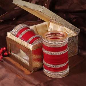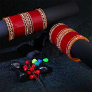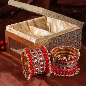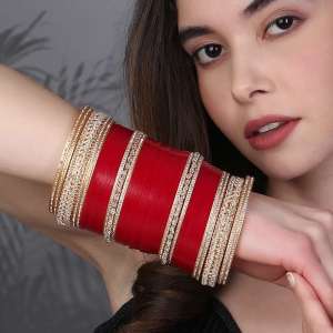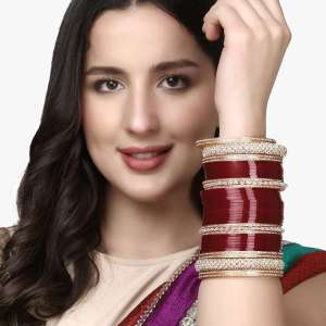 Set of 33 Acrylic bangle Red Gold-plated Stone-Studded Wedding Bridal embellished bangles&Chuda with intricate textured and beaded detailing, slip on closure,These are of High quality Stone studded and is long lasting and non allergic to skin.