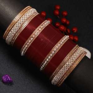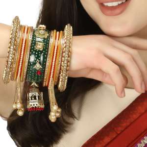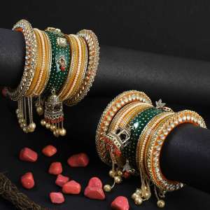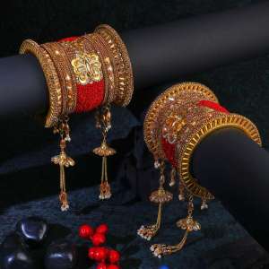 Set of Gold-Plated Bangles Stone-Studded Set for Wedding Bridal embellished bangles&Chuda with intricate textured and beaded detailing, slip on closure,These are of High quality Stone studded and is long lasting and non allergic to skin.