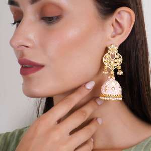 Women Gold Plated Pink Stone Studded Dome Jhumkas with Push Back Closure. Our Gold Plating is long lasting and non-allergic to skin. It Give you a beautiful elegant look with our outfit.