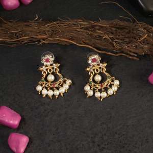 Women 24CT Gold-Plated Handcrafted Multi Stone-Studded white Pearl Earring ,Gold-Plated,and has artificial stones,Secured with a Post back closure.