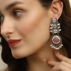 Silver-Plated White Pearl-Tessel Pink Drop Earrings. and has artificial stones,Secured with a fraction Back closure.