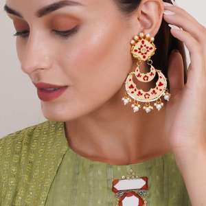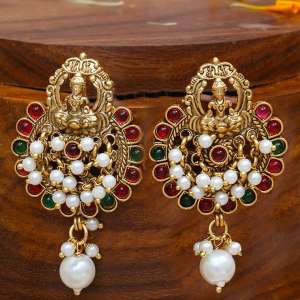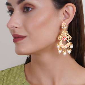 Women Gold Plated Green and Red Stone Studded and White Pearl Beaded Godess Laxmi Design Earrings with Push Back Closure. Our Gold Plating is long lasting and non-allergic to skin. It Give you a beautiful elegant look with our outfit.