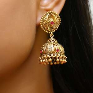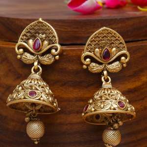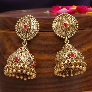Women Gold Plated Red Stone Studded Floral Design Dome Jhumkas with Push Back Closure. Our Gold Plating is long lasting and non-allergic to skin. It Give you a beautiful elegant look with our outfit.