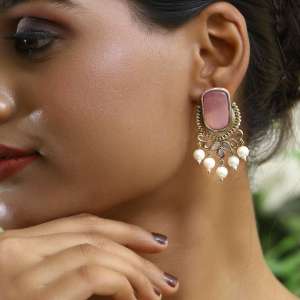 Women Gold Plated Pink Stone Studded with Pearl Tessel Earrings. , Our Gold Plating is long lasting and non-allergic to skin