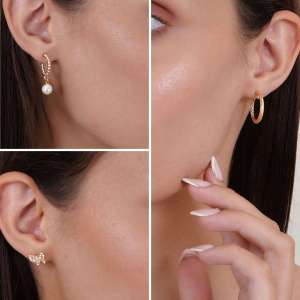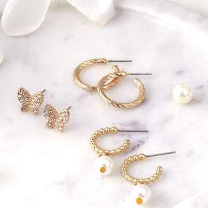 Women Gold-Plated Set of 3 Contemporary Earrings, Butterfuly Studs and half Hoops with push-back Closure. Our Gold Plating is long lasting and non-allergic to skin. It Give you a beautiful elegant look with our outfit.