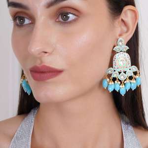 Gold Plated Skyblue Enamel Stone & Pearl Dome Shape Earrings are elegant accessories that blend classic charm with a touch of sparkle. Crafted with a gold-toned finish, these earrings feature intricately designed floral motifs, embellished with shimmering rhinestones for added brilliance. Perfect for elevating both everyday and special occasion outfits, these studs exude sophistication and timeless style.