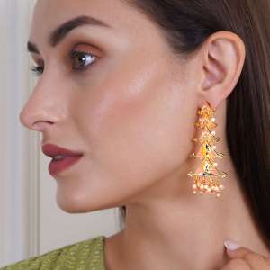 Women Gold Plated Pearl Studded and Tessels Raja Rani Design Dangler Earrings. Our Gold Plating is long lasting and non-allergic to skin. It Give you a beautiful elegant look with our outfit. We have lauching our new colorful color that matches with all your colorful outfits