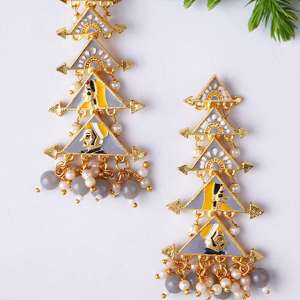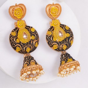 Gold Plated Black & Mustard Stone Studded Hanging Pearl Emamel Rose Design Earrings are elegant accessories that blend classic charm with a touch of sparkle. Crafted with a gold-toned finish, these earrings feature intricately designed floral motifs, embellished with shimmering rhinestones for added brilliance. Perfect for elevating both everyday and special occasion outfits, these studs exude sophistication and timeless style.