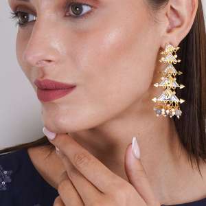 These Women Gold Plated Stone Studded Layered Flower Design Earrings beautifully combine delicate floral artistry with sparkling stone embellishments. Featuring intricately layered flower motifs, this pair is finished with rich gold plating for a luxurious and timeless look. Durable and tarnish-resistant, these earrings add an elegant touch to both everyday wear and special occasions, making them a versatile addition to your jewelry collection