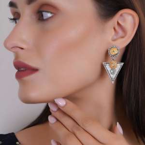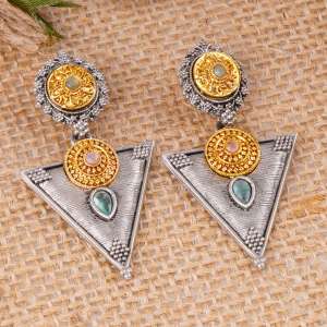 Silver Plated Triangle Filigree Oxidised Earrings with Flower Design & Crystal are artistic jewelry pieces featuring intricate triangular filigree work and delicate floral motifs. The oxidized silver finish adds a vintage charm, while sparkling crystals enhance their elegance. These earrings are perfect for ethnic or bohemian outfits, making a bold yet graceful style statement.