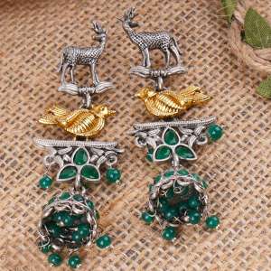 Silver Plated Deer & Bird Design Oxidised Earrings with Green Pearl