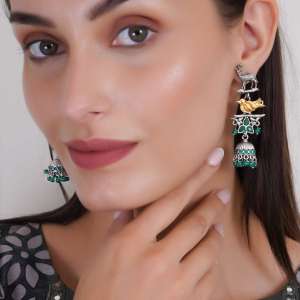 Silver Plated Deer & Bird Design Oxidised Earrings with Green Pearl are beautifully crafted accessories featuring intricate motifs of deer and birds. The oxidized silver finish provides a vintage charm, while the striking green pearls add a pop of color. Perfect for ethnic wear or festive occasions, these earrings blend nature-inspired artistry with elegant sophistication.
