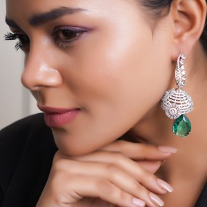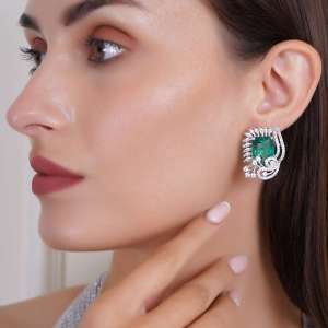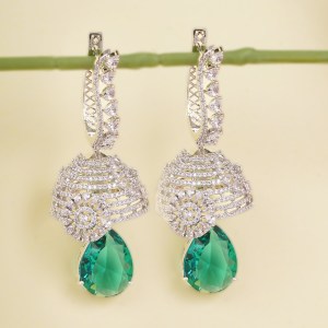 Rhodium Plated Cyan Emerald AD A Grade Stone Studded Earrings