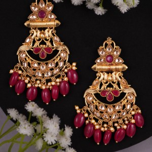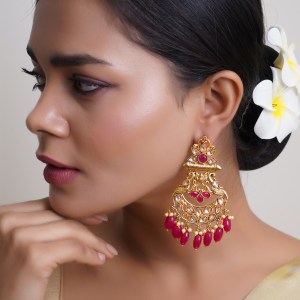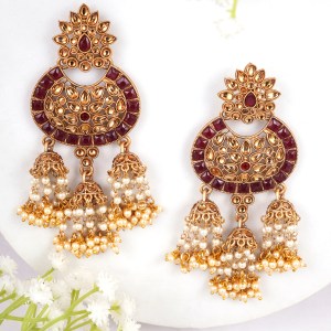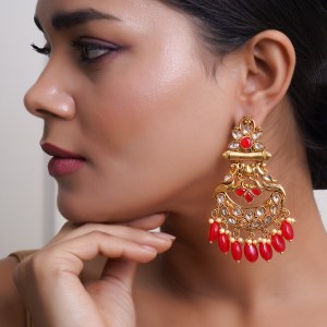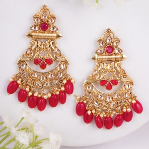 Women Gold Plated Red Stone and Kundan Studded Dome Jhumkas with Push Back Closure. Our Gold Plating is long lasting and non-allergic to skin. It Give you a beautiful elegant look with our outfit.
