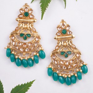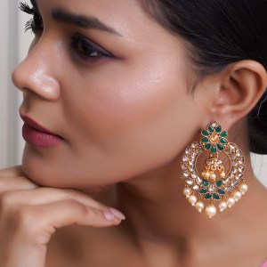 Women Gold Plated Green Stone Studded Pearl Beaded Dome Jhumkas with Push Back Closure. Our Gold Plating is long lasting and non-allergic to skin. It Give you a beautiful elegant look with our outfit.
