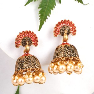Gold Plated Red Enamel Peacock Shape Pearl Dome Earrings are elegant accessories that blend classic charm with a touch of sparkle. Crafted with a gold-toned finish, these earrings feature intricately designed floral motifs, embellished with shimmering rhinestones for added brilliance. Perfect for elevating both everyday and special occasion outfits, these studs exude sophistication and timeless style.