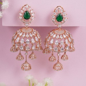 RoseGold Plated CZ & Emerald Stone Studded Dome Shape Jhumkas