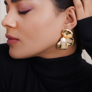 Women Gold Plated Floral Degign Pearl Beaded Earrings