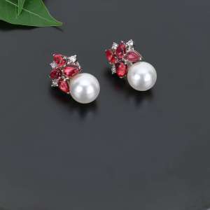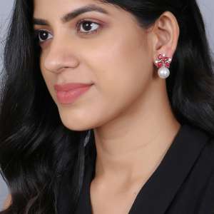 Silver-Plated Handcrafted Red Ruby and Pearl Studded Earrings.,and has artificial stones,Secured with a fraction Back closure.