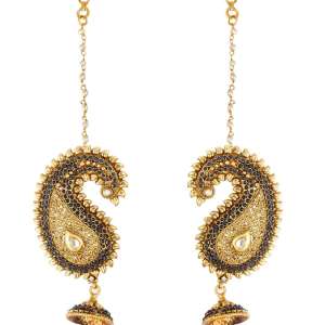 Women 24 CT Gold-Plated Stone-Studded Gold-Pearl Tessel Leaf Temple Jhumka with Chain, An Elegent Handcrafted Design of Jhumka Earring ,Gold-Plated,and has artificial stones,Secured with a Post back closure.