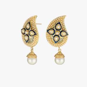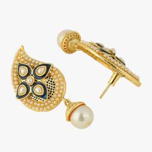 24 CT Women Gold-Plated Royal Pearl and Stone Studded Drop Shaped Earing, Gold-plated,and has artificial stones,Secured with a post and back closure.