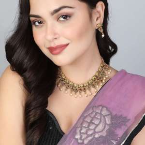 Silver-Plated Pink Stone-Studded Pearl-Tessel Chocker and Earrings Set This jewellery set consist Stone Silver-plated and stranded with Drawstring closure.,