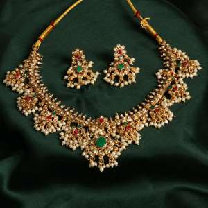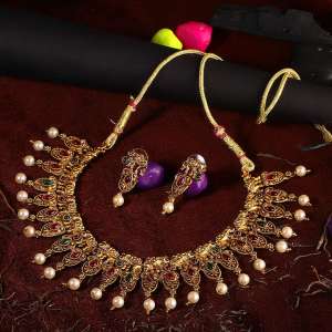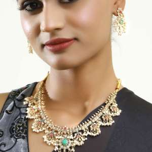 Women 24CT Gold-Plated Multicolor Red Green Stone-Studded Elephant Temple White Pearl-Tessels Necklace with Earring Jewellery Set. This jewellery set consist Stone Gold-plated and stranded with Drawstring closure.,