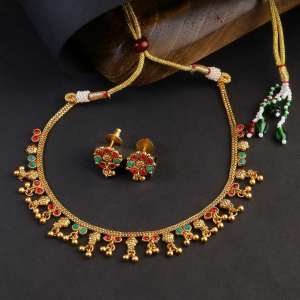 Women Gold Plated Red & Greeb Stone Choker Necklace and Earrings Set, A beautiful handcrafted gold plated necklace with pair of matching earrings in red color designed with stones. Adorn yourself with this beautifully handcrafted necklace to create a statement look. Enhance your look with this set and wear it with any traditional outfit. This piece gives you the elegant look that makes everyone heads turn on you. The necklace is secured with a drawstring closure & earrings with a post-and-back closure. Our jewellery is designed and made in India supporting hundreds of local Indian artisans.