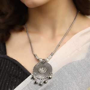 Women Stylish Boho Silver Plated Oxidised Long Chain Pendant. The Pendent Set secured with a S-hook Closure.
