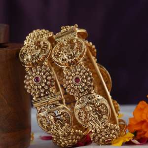 Gold Plated Antique Floral Motif Stone Studded Temple Jewellery Set