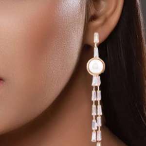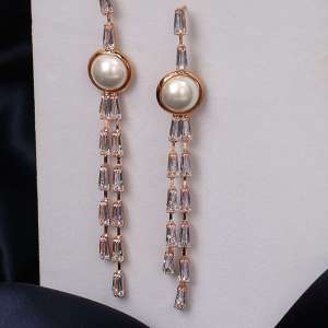 Women Rose Gold Plated White Pearl Studded amd Stone Studded Tessels Drop Earrings. Our Rose Gold Plating is long lasting and non-allergic to skin. It Give you a beautiful elegant look with our outfit.