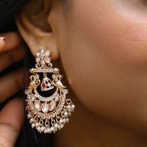 Gold Plated Stone Studded Pearl Beaded Peacock Design Earrings