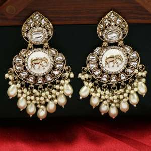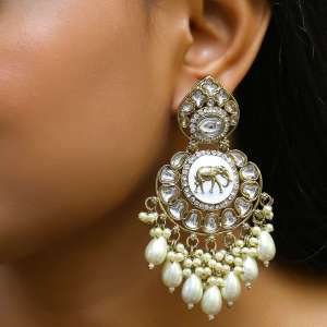 Women Gold Plated Kundan Studded and Pearl Tessels Elephant Design Earrings. Our Gold Plating is long lasting and non-allergic to skin. It Give you a beautiful elegant look with our outfit.