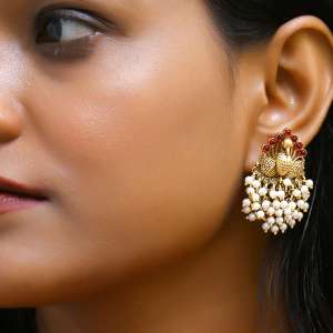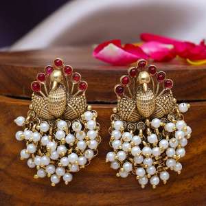 Women Gold Plated Red Stone Studded and White Pearl Beaded Peacock Design Earrings with Push Back Closure. Our Gold Plating is long lasting and non-allergic to skin. It Give you a beautiful elegant look with our outfit.