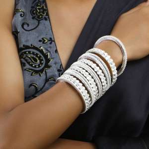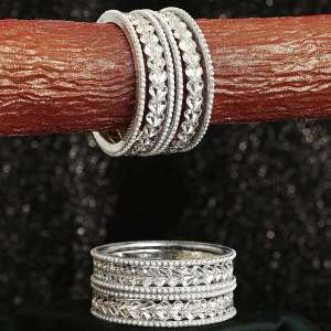 Women Set of 12 Leaf Design Stone Studded White Bangles