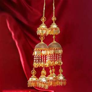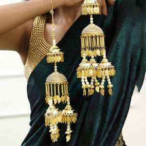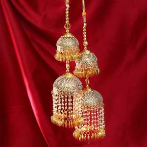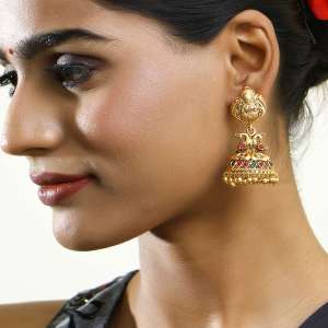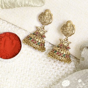 Women Gold Plated Laxmi Temple Stone Studded Dome Shape Jhumki. Our Gold-Plated is long lasting and non-allergic to skin