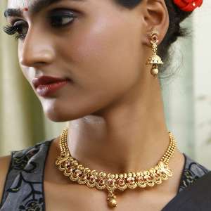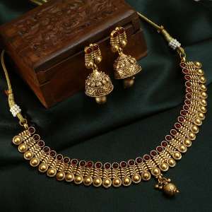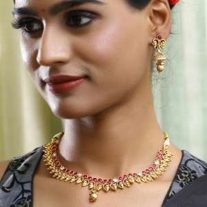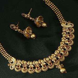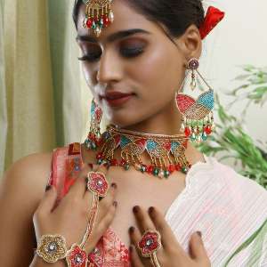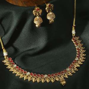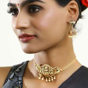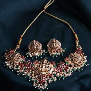 Women Gold Plated Red and Green Stone Studded Peacock and Laxmi Design White Pearl Tessel Traditional Chocker and Jhumkis. Our Gold Plating is long lasting and non-allergic to skin