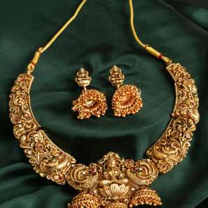 Women Gold Plated Pink and Green Stone Studded Peacock and Laxmi Design Half Dome Tessel Traditional Necklace and Jhumkis. Our Gold Plating is long lasting and non-allergic to skin.