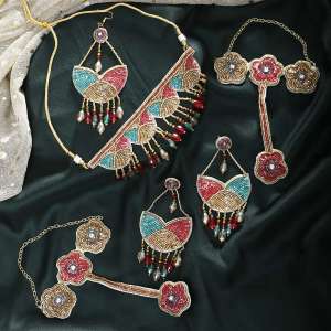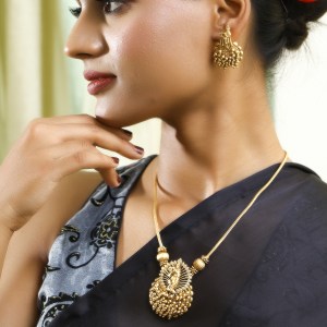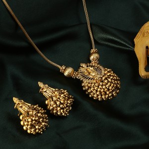 This jewellery set consists Design Temple with Peacock Shapped of a Long necklace and earrings,Gold-Plated with pink and Green Stone-Studded necklace, secured with a hook closure,Comes with a pair of matching Gold-Plated -studded handcrafted drop earrings, secured with a post and back closure,Gold-Plated is long lasting and non allergic to skin.