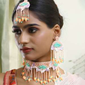 Woman Peach Beaded with Mangtika Handcrafted Jewellery Set,Material and stone type: alloy with artificial stones and beads,secured with a drawstring closure, A pair of matching earrings, secured with a post and back closure, This is long-lasting and non-allergic to skin