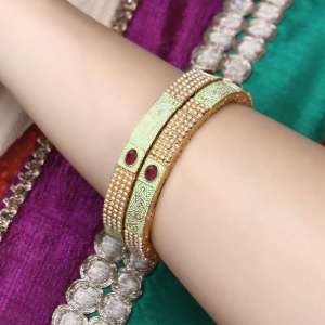 Women Gold Plated Dark Green Velvet Stone Studded Flower Design Bangles.